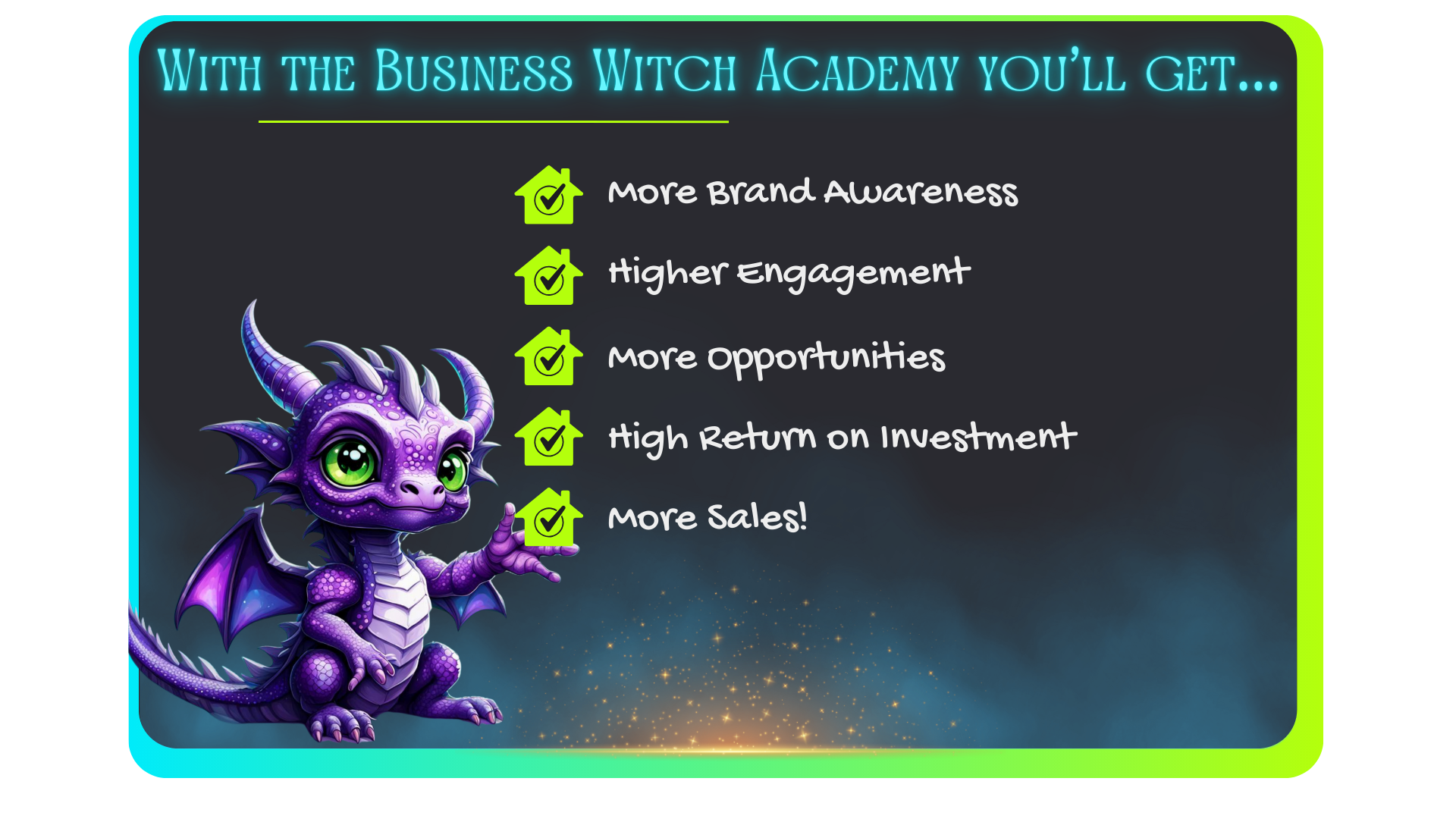 With the Business Witch Academy’s Targeted Marketing Boost Automation, I turn your hard work into results by promoting your blogs, videos, podcasts, courses and events to an engaged audience of over 20,000 entrepreneurs, helping you attract the right customers effortlessly.