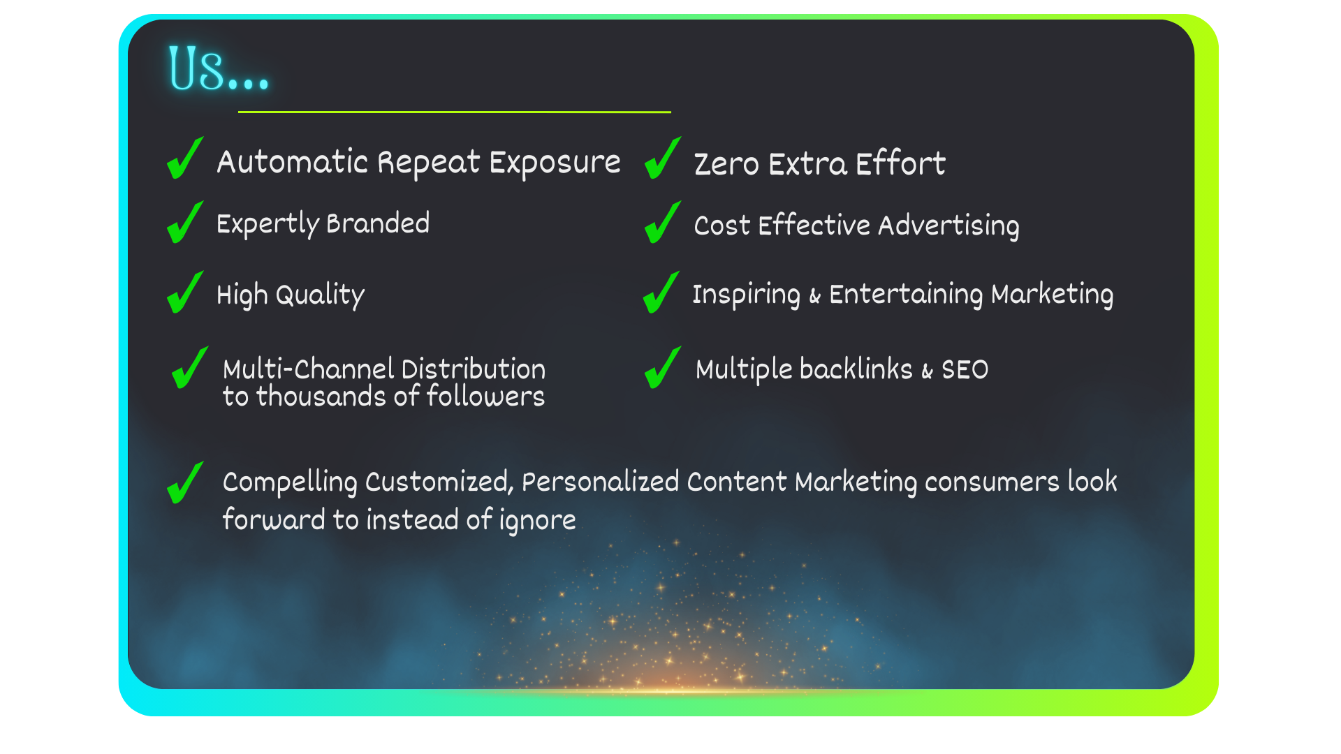 Complete our intake form after purchase to provide us with your contact information and links to your marketing channels. After that, everything will automatically be taken care of for you.