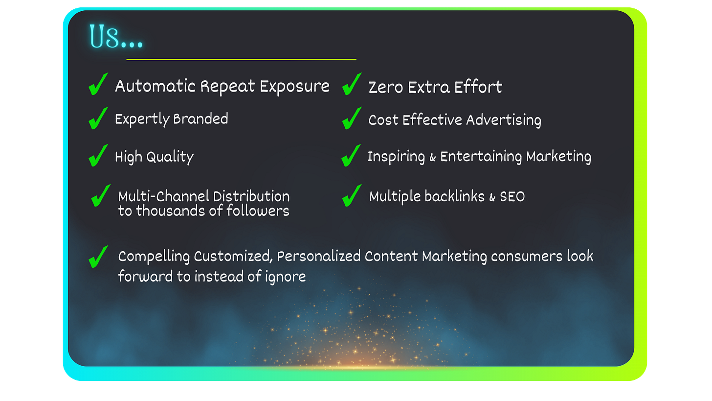 Automation = Provide your Blog RSS link, social media pages, podcast link, or YouTube Channel and we'll automatically check it for new content each week and share with our subscribers.