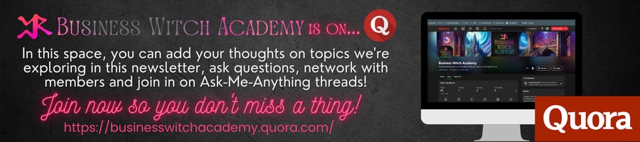 The Business Witch Academy is excited to announce a new way to join in on the conversation. We are now hosting a discussion forum on Quora. In this space, you can add your thoughts on topics we're exploring in this newsletter, ask questions, network with members and join in on Ask-Me-Anything threads! Join now so you don't miss a thing!
