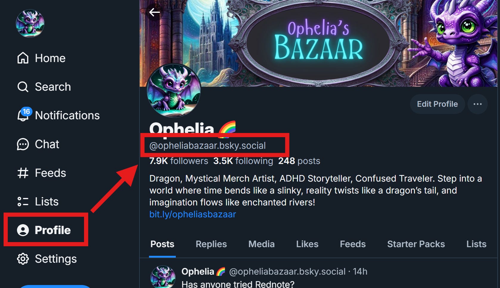To verify, navigate to your BlueSky Profile and you’ll see your handle underneath your profile image.