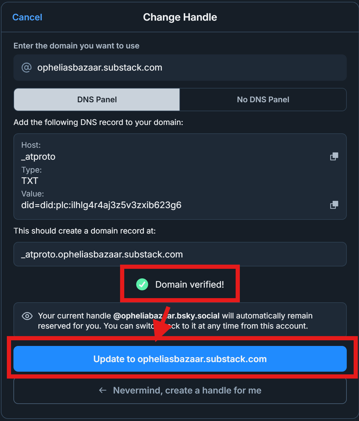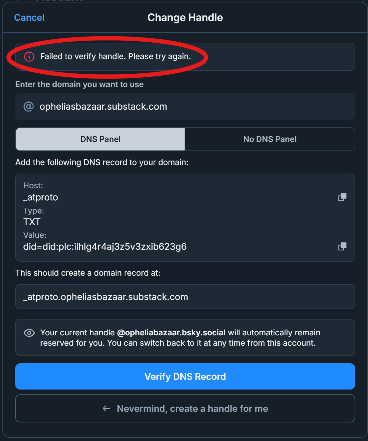 Check back in later and click the Verify DNS Record button again. In truth, it took Ophelia and I about an hour and half for the verification to be a success. However, it can take up to 24-48 hours for the information you updated in Substack to propagate through systems. This is entirely normal, and true whether you're setting up a Substack handle or one attached to a domain name you own. This is an internet thing, not a Substack thing.